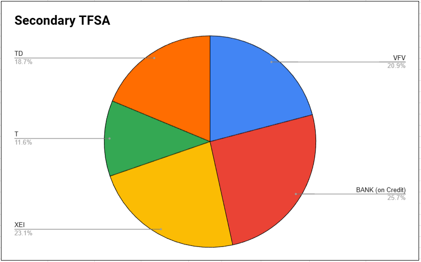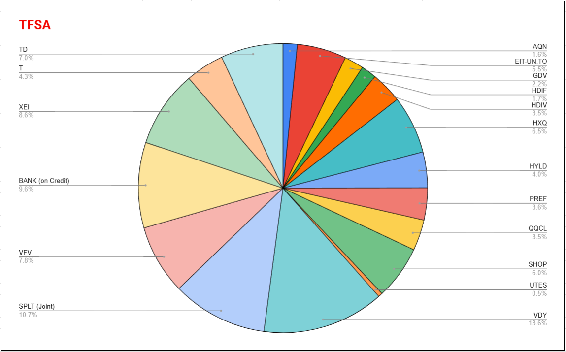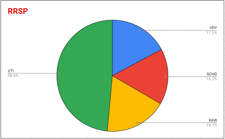 - percentages are calculated based on current market value, USD is converted to CAD based on google finance rate