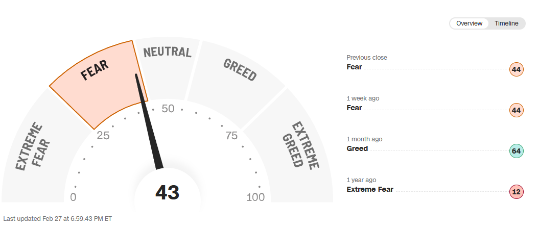 A bit of a change up from last month as we have dipped from the bottom of greed through neutral and landed just in the fear territory. Definitely some uncertainty now with the SAAS-mageddon we have going on paired with all of the hyper-scalers devoting basically their entire cash flow to capital expenditure on chips this year. I’m talking Google, Amazon and Meta although there are likely others in the same position.
