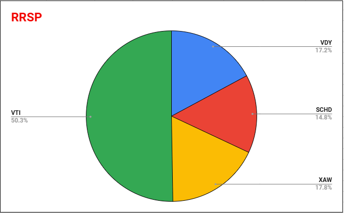 - percentages are calculated based on current market value, USD is converted to CAD based on google finance rate