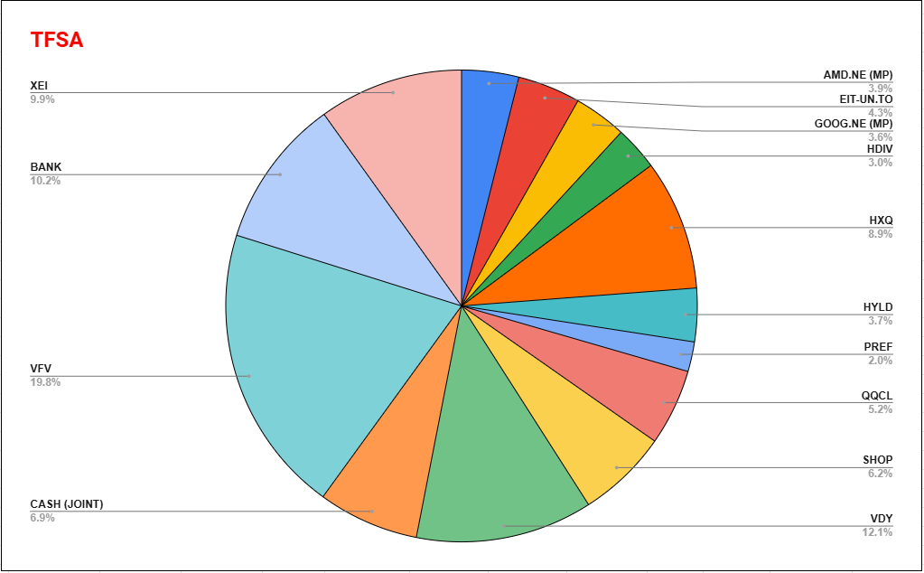 - percentages are calculated based on current market value, USD is converted to CAD based on google finance rate